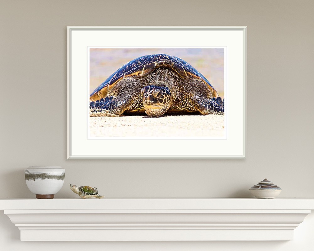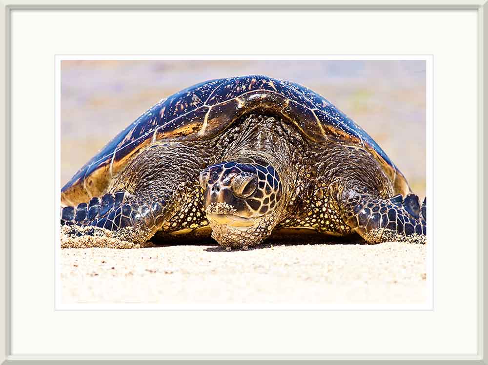 A Hawaiian Green Sea Turtle on a Hawaiian beach.